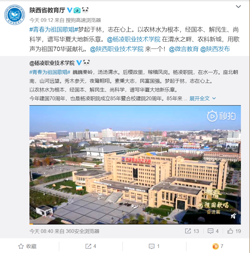 陕西省教育厅官方微博转发我院“青春为祖国歌唱”拉歌视频微博。