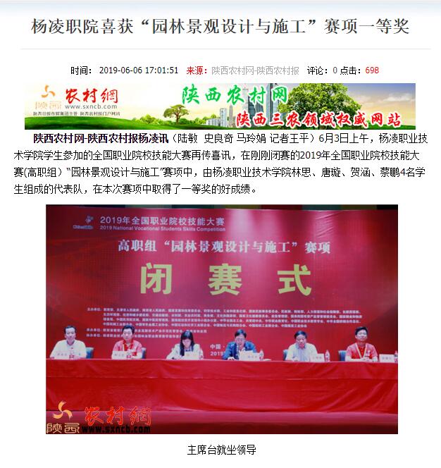 陕西农村网-陕西农村报杨凌讯(陆敏  史良奇 马玲娟 记者王平)6月3日上午,杨凌职业技术学院学生参加的全国职业院校技能大赛再传喜讯,在刚刚闭赛的2019年全国职业院校技能大赛(高职组)“园林景观设计与施工”赛项中,由杨凌职业技术学院林思、唐璇、贺涵、蔡鹏4名学生组成的代表队,在本次赛项中取得了一等奖的好成绩。