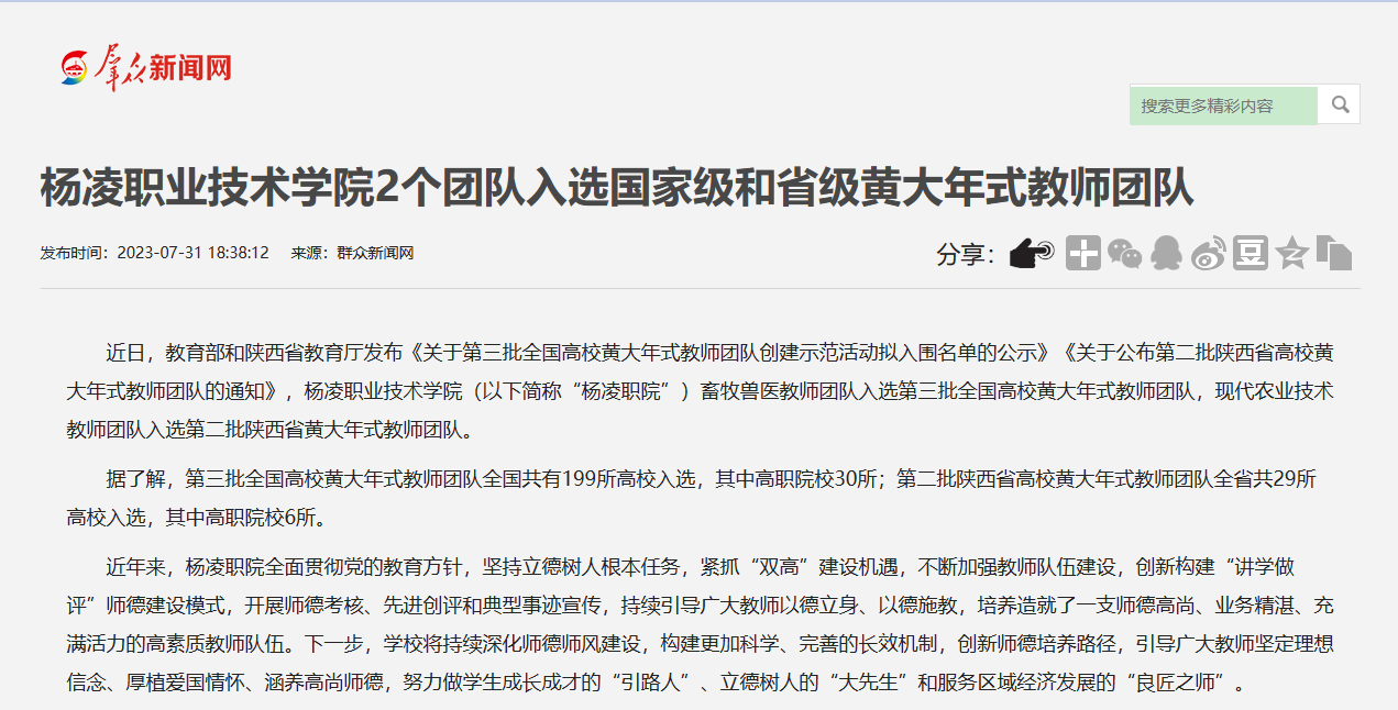 近日,教育部和陕西省教育厅发布《关于第三批全国高校黄大年式教师团队创建示范活动拟入围名单的公示》《关于公布第二批陕西省高校黄大年式教师团队的通知》,杨凌职业技术学院畜牧兽医教师团队入选第三批全国高校黄大年式教师团队,现代农业技术教师团队入选第二批陕西省黄大年式教师团队。