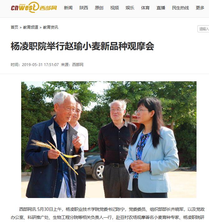 西部网讯 5月30日上午,杨凌职业技术学院党委书记陈宁,党委委员、组织部部长齐晓军,以及党政办公室、科研推广处、生物工程分院等相关负责人一行,赴豆村农场观摩著名小麦育种专家、杨凌职院研究员赵瑜培育的优质强筋高产小麦新品种武农6号、武农611和大穗大粒优质高产小麦新品种武农981。