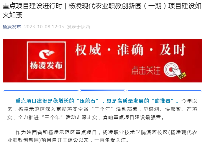 作为陕西省和杨凌示范区重点项目,杨凌职业技术学院滨河校区(杨凌现代农业职教创新园)项目自开工建设以来,一直备受关注。