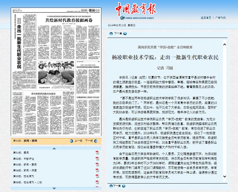 5月15日,《中国教育报》3版头条以《面向农民开展“学历+技能”全日制教育 杨凌职业技术学院:走出一批新生代职业农民》为题,报道了我院建立“一体两翼”新型职业农民教育体系的创新做法及成效。