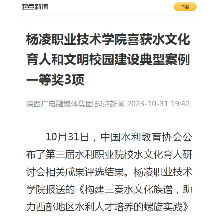 10月31日,中国水利教育协会公布了第三届水利职业院校水文化育人研讨会相关成果评选结果。杨凌职业技术学院报送的《构建三秦水文化族谱,助力西部地区水利人才培养的螺旋实践》和《我和班主任共学水文化:打造水文化特色高职名班主任工作室的探索实践》2个案例获水文化育人典型案例一等奖,报送的《挖掘后稷文化 传承千年文脉 打造杨职特色文明校园品牌》案例获文明校园建设典型案例一等奖。