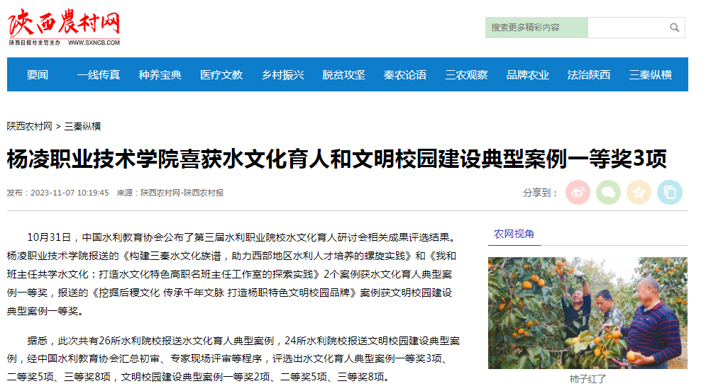 10月31日,中国水利教育协会公布了第三届水利职业院校水文化育人研讨会相关成果评选结果。杨凌职业技术学院报送的《构建三秦水文化族谱,助力西部地区水利人才培养的螺旋实践》和《我和班主任共学水文化:打造水文化特色高职名班主任工作室的探索实践》2个案例获水文化育人典型案例一等奖,报送的《挖掘后稷文化 传承千年文脉 打造杨职特色文明校园品牌》案例获文明校园建设典型案例一等奖。