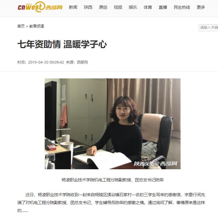 近日,杨凌职业技术学院收到一封来自杨陵区揉谷镇石家村一名初三学生写来的感谢信,字里行间充满了对机电工程分院副教授、团总支书记、学生辅导员陈荣的感激之情。通过询问了解,事情原来是这样的……