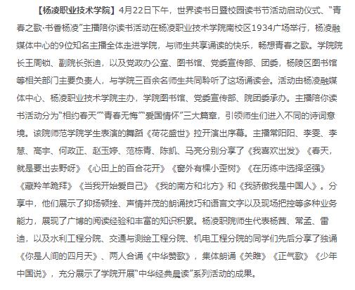 【杨凌职业技术学院】4月22日下午,世界读书日暨校园读书节活动启动仪式、“青春之歌·书香杨凌”主播陪你读书活动在杨凌职业技术学院南校区1934广场举行,杨凌融媒体中心的9位知名主播全体走进学院,与师生共享诵读的快乐,畅想青春之歌。学院院长王周锁、副院长张迪,以及党政办公室、图书馆、党委宣传部、团委,杨陵区图书馆等相关部门主要负责人,与学院三百余名师生共同聆听了这场诵读会。活动由杨凌融媒体中心、杨凌职业技术学院主办,学院图书馆、党委宣传部、院团委承办。主播陪你读书活动分为“相约春天”“青春无悔”“爱国情怀”三大篇章,引领师生们进入不同的诗词意境。该院师范学院学生表演的舞蹈《荷花盛世》拉开演出序幕。主播常阳阳、李雯、李慧、高宇、何政正、赵玉婷、范栋青、陈凯、马亮分别分享了《我喜欢出发》《春天,就是要出去野呀》《心田上的百合花开》《窗外有棵小歪树》《在历练中选择坚强》《藏羚羊跪拜》《当我开始爱自己》《我的南方和北方》和《我骄傲我是中国人》。分享中,他们展示了抑扬顿挫、声情并茂的朗诵技巧和语言文字以及现场把控等多种业务能力,展现了广博的阅读经验和丰富的知识积累。杨凌职院师生代表杨茜、常孟、雷迪,以及水利工程分院、交通与测绘工程分院、机电工程分院的同学们先后分享了独诵《你是人间的四月天》、两人合诵《中华赞歌》,集体朗诵《关雎》《正气歌》《少年中国说》,充分展示了学院开展“中华经典晨读”系列活动的成果。