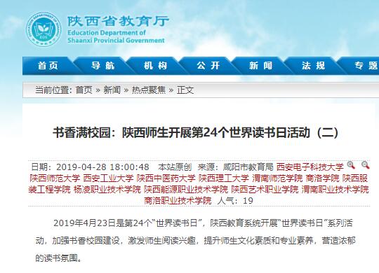 2019年4月23日是第24个“世界读书日”,陕西教育系统开展“世界读书日”系列活动,加强书香校园建设,激发师生阅读兴趣,提升师生文化素质和专业素养,营造浓郁的读书氛围。