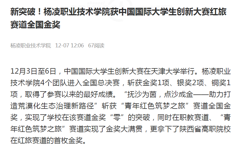 12月3日至6日,中国国际大学生创新大赛在天津大学举行。杨凌职业技术学院4个团队进入全国总决赛,斩获金奖1项、银奖2项、铜奖1项,取得了参赛以来的最好成绩。“抚沙为茵,点沙成金——助力打造荒漠化生态治理新路径”斩获“青年红色筑梦之旅”赛道全国金奖,实现了学校在该赛道金奖“零”的突破,同时在职教赛道、“青年红色筑梦之旅”赛道实现了金奖大满贯,更拿下了陕西省高职院校在红旅赛道的首枚金奖。