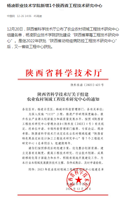 12月20日,陕西省科学技术厅公布了农业农村领域工程技术研究中心组建名单,杨凌职业技术学院获批建设“陕西省草莓工程技术研究中心”。是继2022年获批“陕西省动物疫病防控工程技术研究中心”后,又一省级工程中心获批。