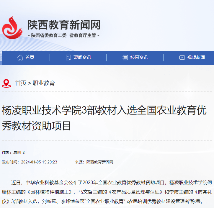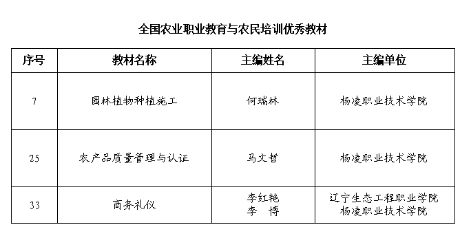 近日,中华农业科教基金会公布了2023年全国农业教育优秀教材资助项目,杨凌职业技术学院何瑞林主编的《园林植物种植施工》、马文哲主编的《农产品质量管理与认证》和李博主编的《商务礼仪》3部教材入选,刘新燕、李峰博荣获“全国农业职业教育与农民培训优秀教材建设管理者”称号。