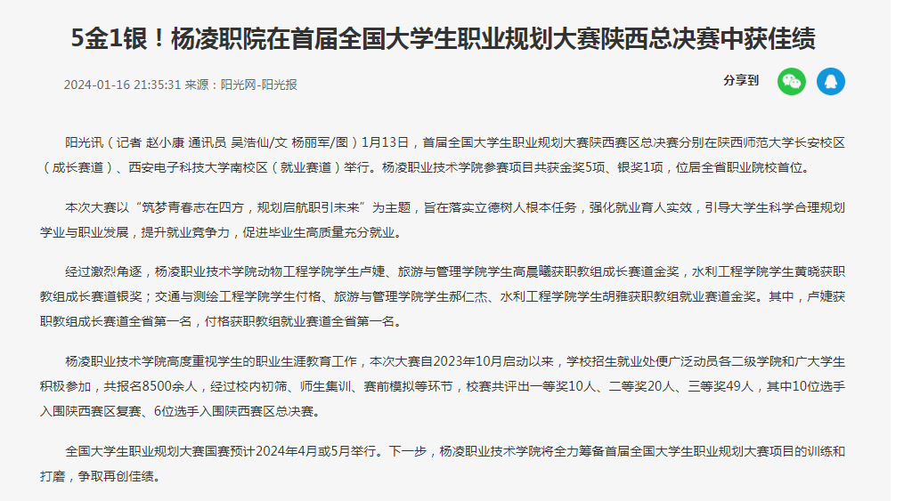 1月13日,首届全国大学生职业规划大赛陕西赛区总决赛分别在陕西师范大学长安校区(成长赛道)、西安电子科技大学南校区(就业赛道)举行。杨凌职业技术学院参赛项目共获金奖5项、银奖1项,位居全省职业院校首位。