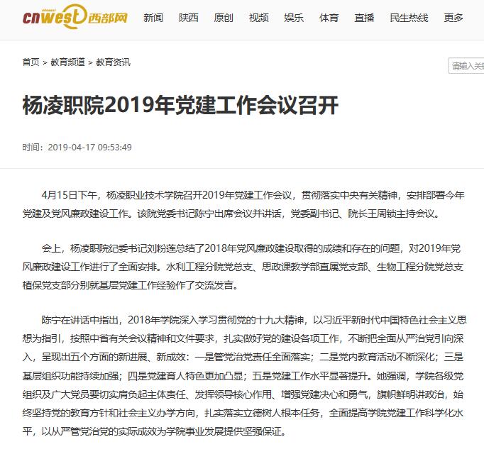 4月15日下午,杨凌职业技术学院召开2019年党建工作会议,贯彻落实中央有关精神,安排部署今年党建及党风廉政建设工作。该院党委书记陈宁出席会议并讲话,党委副书记、院长王周锁主持会议。