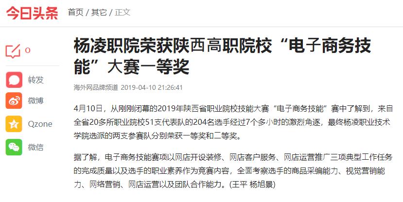4⽉10⽇,从刚刚闭幕的2019年陕⻄省职业院校技能⼤赛“电⼦商务技能”赛中了解到,来⾃全省20多所职业院校51⽀代表队的204名选⼿经过7个多⼩时的激烈⻆逐,最终杨凌职业技术学院选派的两⽀参赛队分别荣获⼀等奖和⼆等奖。