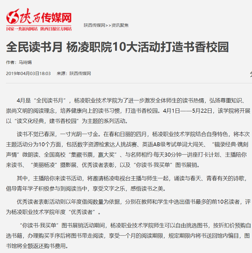 【陕西传媒网】全民读书月 杨职院10大活动打造书香校园