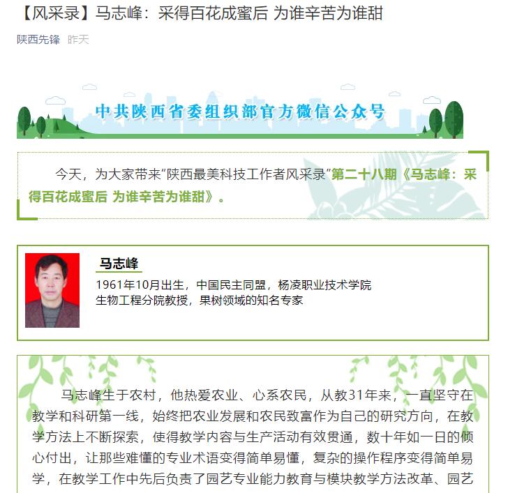 除了果树壁蜂授粉技术,马志峰还致力于苹果腐烂病的研究,先后发表《苹果烂果病流行原因浅析》《农抗120防治苹果轮纹病和斑点落叶病试验》《陕西渭北地区盛果期苹果树腐烂病调查研究》等多篇论文。近年来,他又参与了西北甜柿引种开发、陕西果树产品标准研究、杨凌示范区蔬菜重金属污染分析研究、高效多功能液体肥料的研究与示范等科研项目,研究出许多农村适用的先进农业技术。