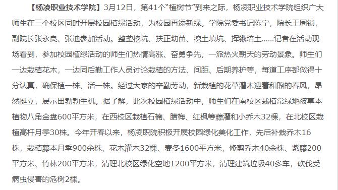 整垄挖坑、扶正幼苗、挖土填坑、挥锹培土……记者在活动现场看到,参加校园植绿活动的师生们热情高涨、奋勇争先,一派热火朝天的劳动景象。师生们一边栽植花木,一边同后勤工作人员讨论栽植的方法、间距、后期养护等,每道工序都做得十分认真,确保植一株、活一株。经过大家的辛勤劳动,新栽植的花草灌木迎着和煦的春风,昂然挺立,展示出勃勃生机。据了解,此次校园植绿活动中,师生们在南校区栽植常绿地被草本植物八角金盘600平方米,在西校区栽植石楠、腊梅、红枫等藤灌和小乔木32棵,在北校区栽植高杆月季30株。今年开春以来,杨凌职院积极开展校园绿化美化工作,先后补栽乔木16株,栽植藤本月季900余株、花木灌木32棵、麦冬1600平方米,修剪乔木40余株、紫藤200平方米、竹林200平方米,清理北校区绿化空地1200平方米,清理建筑垃圾40多车,砍伐受病虫侵害的危树2棵。