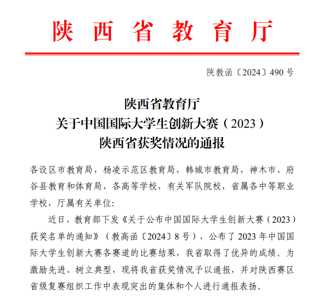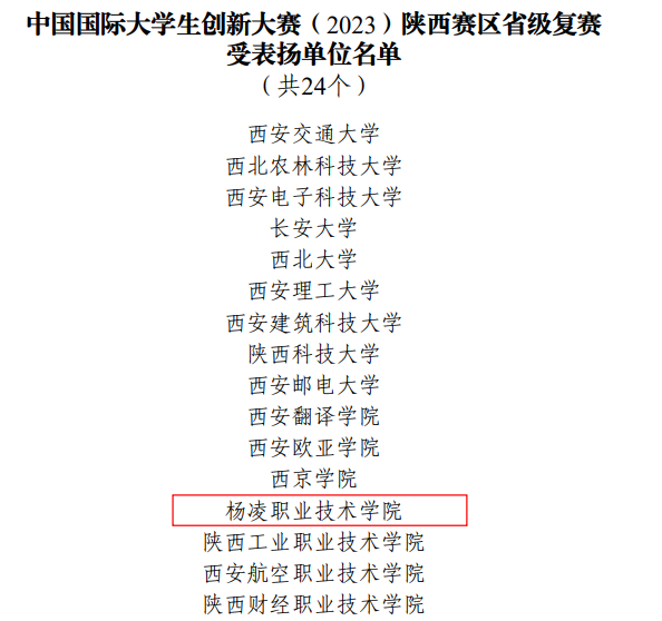阳光讯(记者 赵小康 通讯员 刘颖沙 王皓乐 文/图)近期,省教育厅对中国国际大学生创新大赛(2023)陕西省获奖情况进行了通报,杨凌职业学院荣获陕西赛区省级复赛受表扬单位,创新创业学院杨波、生态环境工程学院季晓莲荣获受表扬个人。