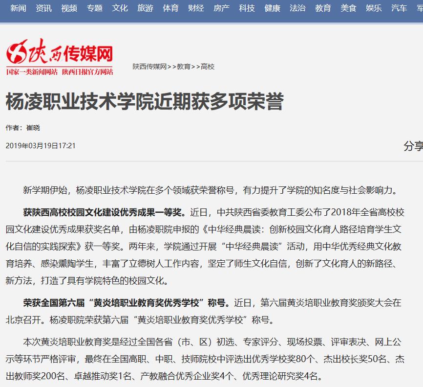 荣获陕西高校校园文化建设优秀成果一等奖。近日,中共陕西省委教育工委公布了2018年全省高校校园文化建设优秀成果获奖名单,由杨凌职院申报的《中华经典晨读:创新校园文化育人路径培育学生文化自信的实践探索》获一等奖。两年来,学院通过开展“中华经典晨读”活动,用中华优秀经典文化教育培养、感染熏陶学生,丰富了立德树人工作内容,坚定了师生文化自信,创新了文化育人的新路径、新方法,打造了具有学院特色的校园文化。