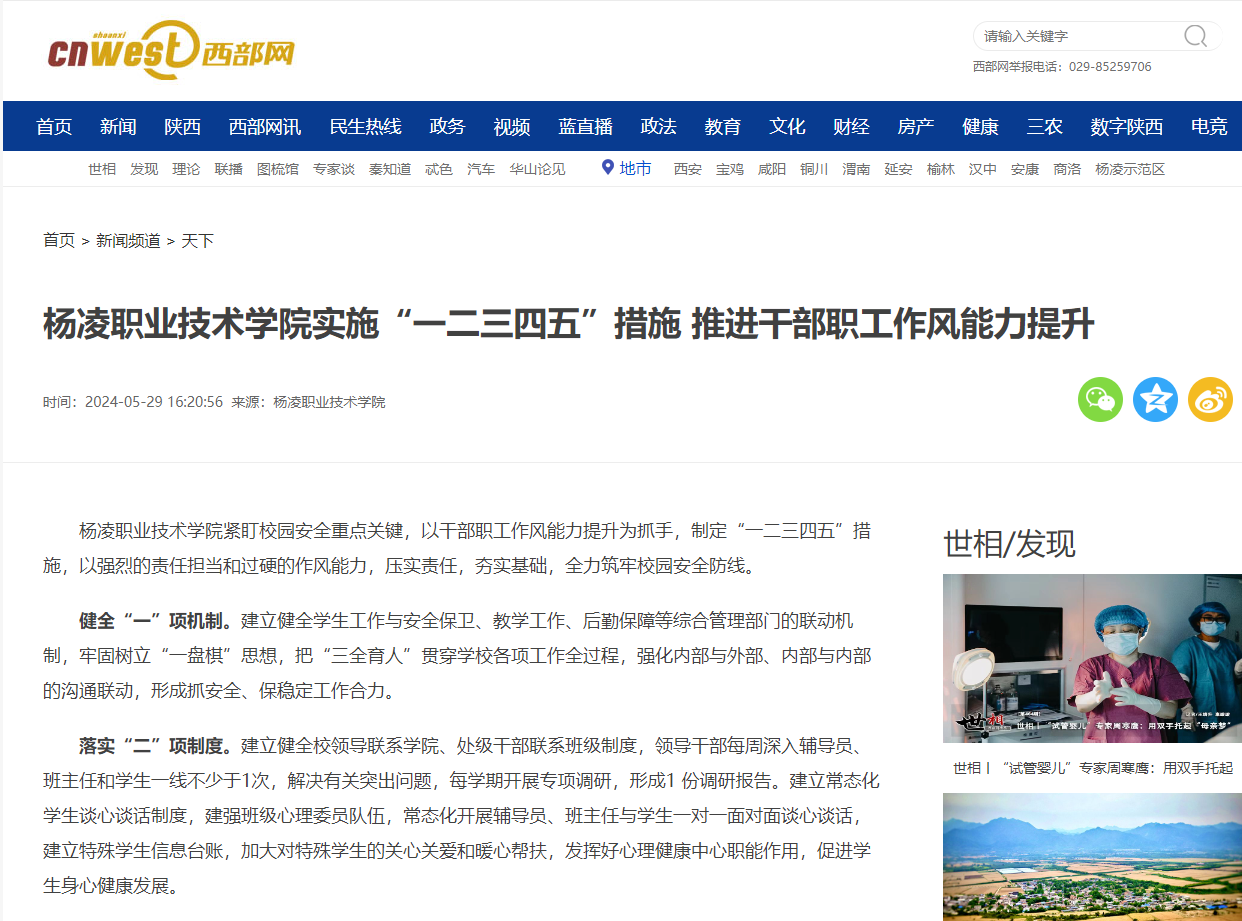 杨凌职业技术学院紧盯校园安全重点关键,以干部职工作风能力提升为抓手,制定“一二三四五”措施,以强烈的责任担当和过硬的作风能力,压实责任,夯实基础,全力筑牢校园安全防线。