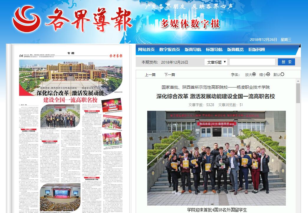 好平台带动高就业率,高就业率带动高质量招生。今年,杨凌职院不仅招收了6600余名2018级新生,还于10月中旬迎来了来自哈萨克斯坦、俄罗斯、吉尔吉斯斯坦、乌兹别克斯坦的18名留学生,他们将在这所具有悠久办学历史、深厚文化底蕴和较强综合实力的高职院校,与中国的莘莘学子一起度过他们美好的大学时光。