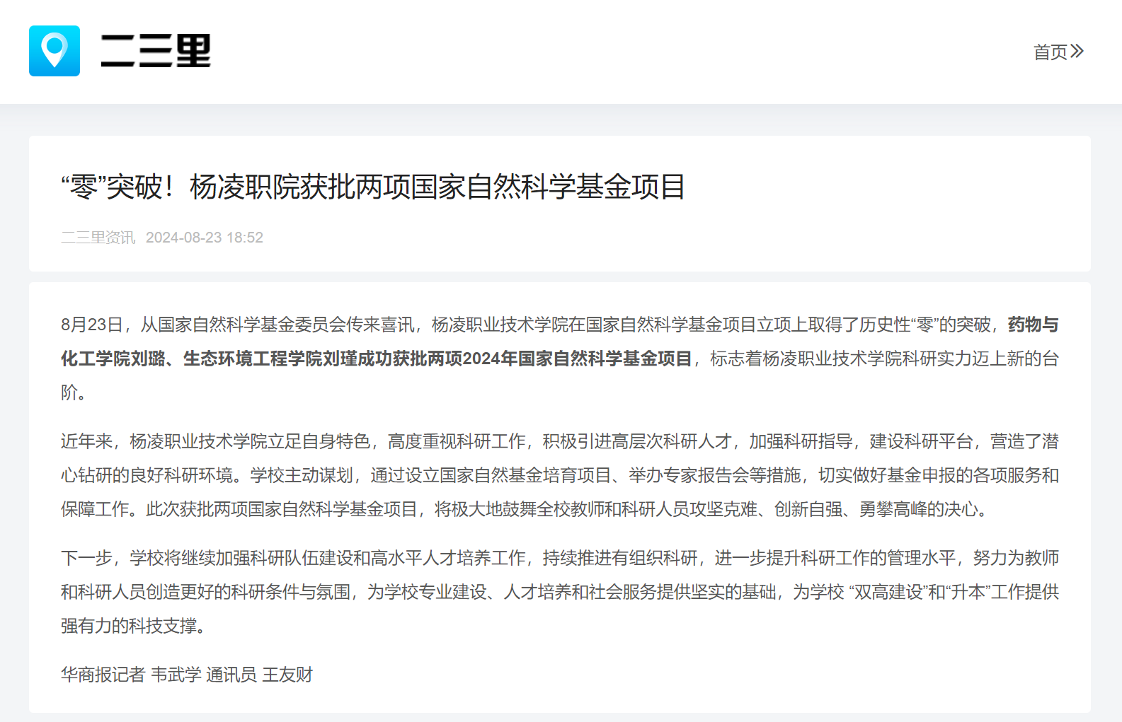 8月23日,从国家自然科学基金委员会传来喜讯,杨凌职业技术学院在国家自然科学基金项目立项上取得了历史性“零”的突破,药物与化工学院刘璐、生态环境工程学院刘瑾成功获批两项2024年国家自然科学基金项目,标志着杨凌职业技术学院科研实力迈上新的台阶。