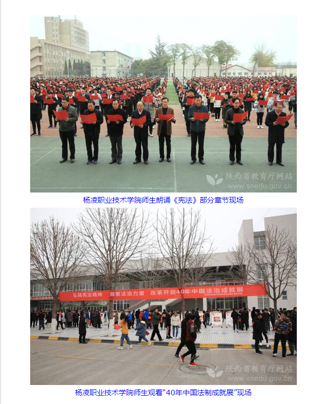【杨凌职业技术学院】12月3日下午,杨凌职业技术学院举行了“千人诵读宪法”主题活动。在升起的五星红旗和雄壮的国歌声中,杨凌职院学生代表王乐怡宣读了《“12.4国家宪法日”学习宪法倡议书》,全体师生目迎仪仗队护送宪法入场。随后,该院千名师生汇集操场,齐声朗诵《宪法》节选部分章节。该院为全院师生每人配发了一本《宪法》小册子,组织全体教职工以党总支或党支部为单位进学习宪法,在全体学生中开展“晨读宪法”活动,举办“40年中国法制成就展”等一系列活动,营造“尊崇宪法的意识在学院全面升华、学习宪法的热潮在学院全面掀起、遵守宪法的行为学院全面养成、维护宪法的责任在学院全面落实、运用宪法的效果在学院全面显现”的良好氛围。杨凌职业技术学院党委副书记任得元、副院长张永良,党委宣传部、学工部、保卫部、院团委等部门负责人,各党总支书记、各分院学工办主任、思政课教学部全体教师,以及2018级学生代表共1000余人参加了活动。