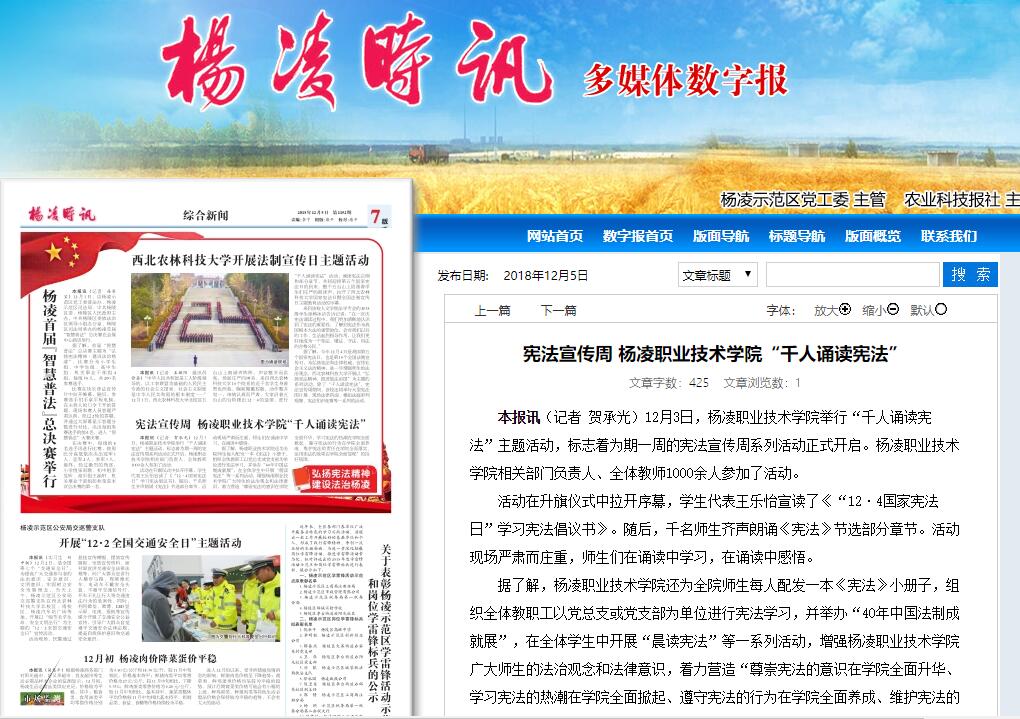 据了解,杨凌职业技术学院还为全院师生每人配发一本《宪法》小册子,组织全体教职工以党总支或党支部为单位进行宪法学习,并举办“40年中国法制成就展”,在全体学生中开展“晨读宪法”等一系列活动,增强杨凌职业技术学院广大师生的法治观念和法律意识,着力营造“尊崇宪法的意识在学院全面升华、学习宪法的热潮在学院全面掀起、遵守宪法的行为在学院全面养成、维护宪法的责任在学院全面落实、运用宪法的效果在学院全面显现”的良好氛围。