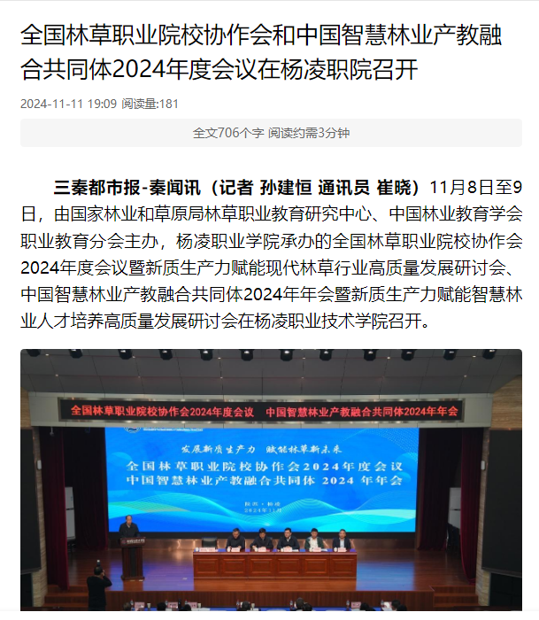 11月8日至9日,由国家林业和草原局林草职业教育研究中心、中国林业教育学会职业教育分会主办,杨凌职业学院承办的全国林草职业院校协作会2024年度会议暨新质生产力赋能现代林草行业高质量发展研讨会、中国智慧林业产教融合共同体2024年年会暨新质生产力赋能智慧林业人才培养高质量发展研讨会在杨凌职业技术学院召开。