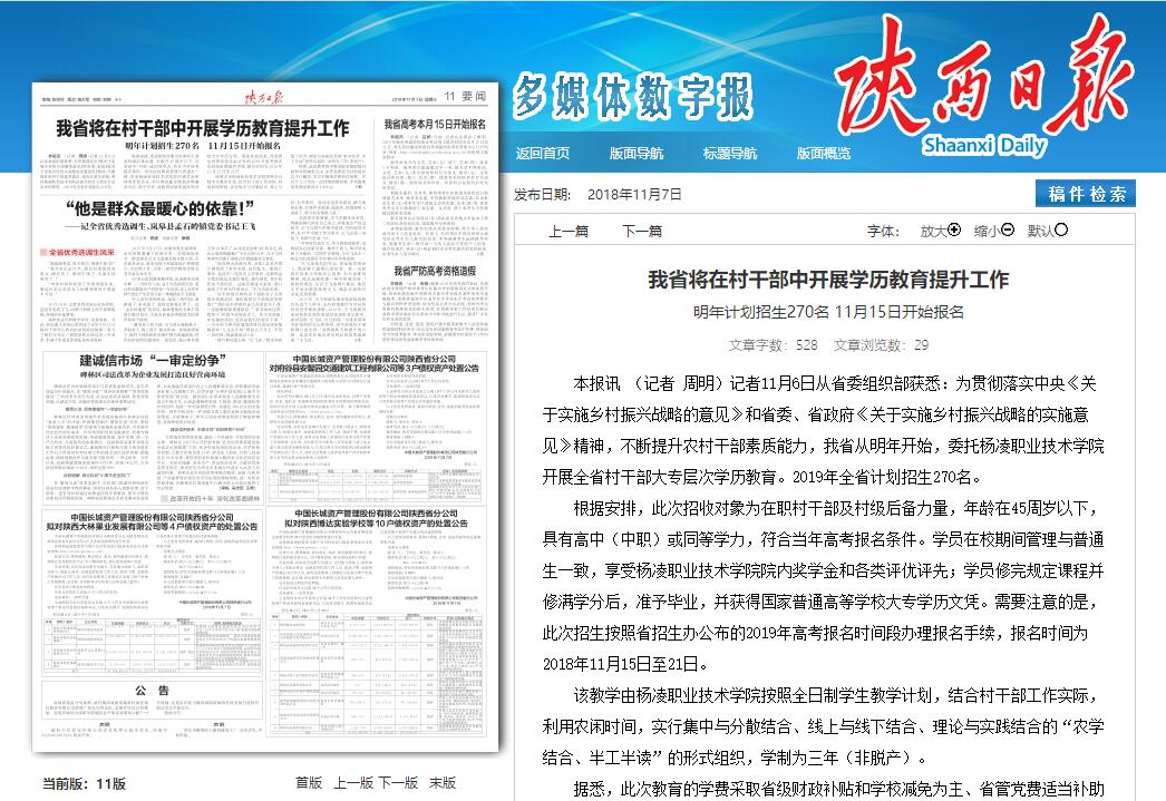 本报讯 (记者 周明)记者11月6日从省委组织部获悉:为贯彻落实中央《关于实施乡村振兴战略的意见》和省委、省政府《关于实施乡村振兴战略的实施意见》精神,不断提升农村干部素质能力,我省从明年开始,委托杨凌职业技术学院开展全省村干部大专层次学历教育。2019年全省计划招生270名。