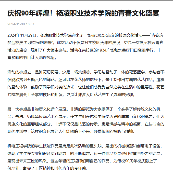 20241129日,杨凌职业技术学院迎来了一场极具纪念意义的校园文化活动——“青春筑梦迎校庆 九秩荣光向未来。此次活动不仅是对学校90周年的庆祝,更是一次展示校园青春活力的盛会,吸引了广大师生参与。活动在南校区的1934广场和水善厅门口隆重举行,丰富多彩的节目让人流连忘返。