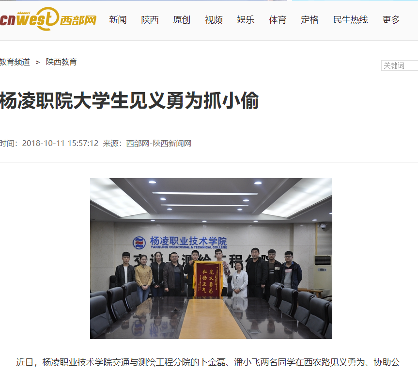 近日,杨凌职业技术学院交通与测绘工程分院的卜金磊、潘小飞两名同学在西农路见义勇为、协助公安干警抓小偷的事迹广为流传,受到了学院师生的纷纷点赞。