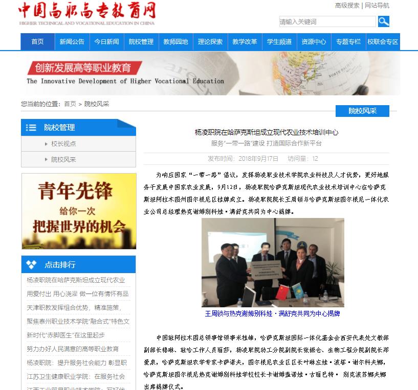 为响应国家“一带一路”倡议,发挥杨凌职业技术学院农业科技及人才优势,更好地服务于发展中国家农业发展,9月12日,杨凌职院哈萨克斯坦现代农业技术培训中心在哈萨克斯坦阿拉木图州图尔根尼区挂牌成立。杨凌职院院长王周锁与哈萨克斯坦图尔根尼一体化农业公司总经理热克谢姆别科娃·满舒克共同为中心揭牌。