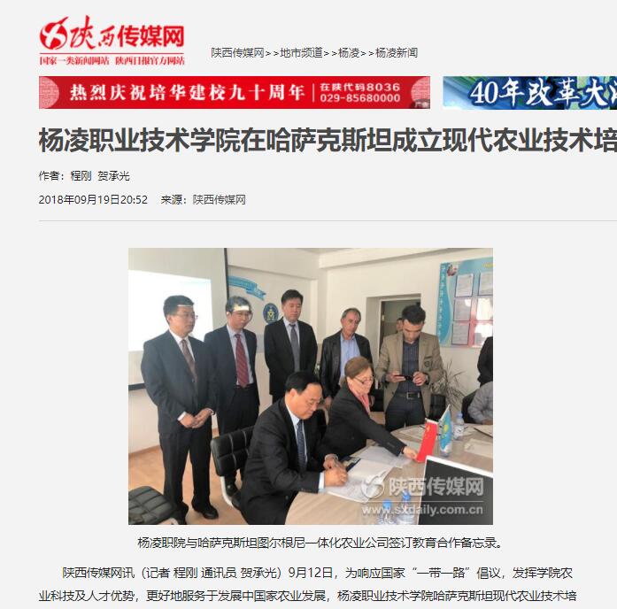 陕西传媒网讯(记者 程刚 通讯员 贺承光)9月12日,为响应国家“一带一路”倡议,发挥学院农业科技及人才优势,更好地服务于发展中国家农业发展,杨凌职业技术学院哈萨克斯坦现代农业技术培训中心在哈萨克斯坦阿拉木图州图尔根尼区挂牌成立。