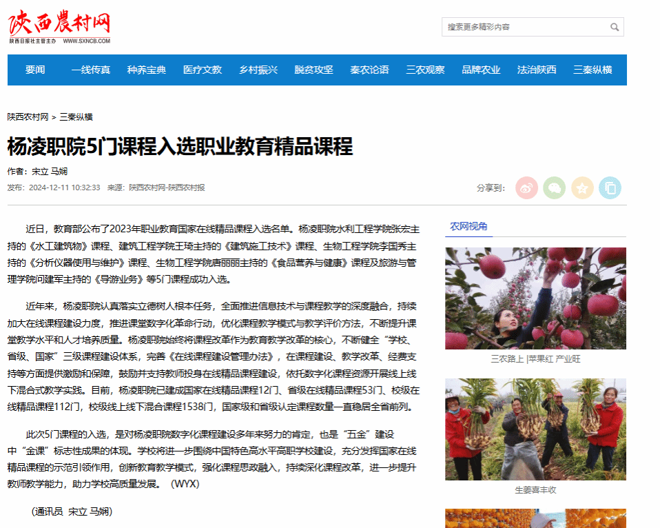 【陕西农村网】杨凌职院5门课程入选职业教育精品课程