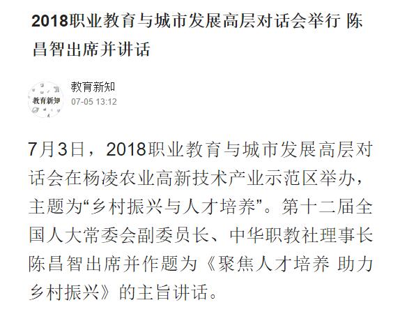 7月3日,2018职业教育与城市发展高层对话会在杨凌农业高新技术产业示范区举办,主题为“乡村振兴与人才培养”。第十二届全国人大常委会副委员长、中华职教社理事长陈昌智出席并作题为《聚焦人才培养 助力乡村振兴》的主旨讲话。