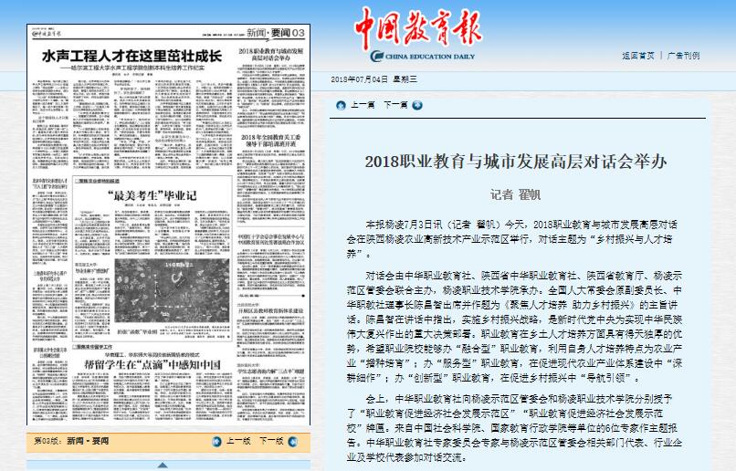 本报杨凌7月3日讯(记者 翟帆)今天,2018职业教育与城市发展高层对话会在陕西杨凌农业高新技术产业示范区举行,对话主题为“乡村振兴与人才培养”。