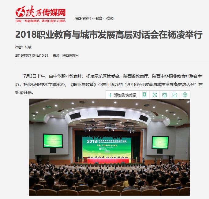 7月3日上午,由中华职业教育社、杨凌示范区管委会、陕西省教育厅、陕西中华职业教育社联合主办,杨凌职业技术学院承办,《职业与教育》杂志社协办的“2018职业教育与城市发展高层对话会”在杨凌开幕。