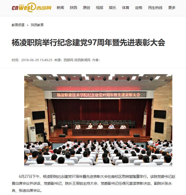 6月27日下午,杨凌职院庆祝建党97周年暨先进表彰大会在南校区思辨堂隆重举行。该院党委书记赵曼出席会议并讲话,党委副书记、院长王周锁主持大会,党委副书记任得元宣读表彰决定,副院长张永良、张迪出席会议。