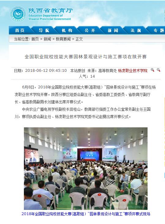 6月8日,2018年全国职业院校技能大赛(高职组)“园林景观设计与施工”赛项在杨凌职业技术学院开赛。陕西分赛区组委会副主任、省委高教工委委员、省教育厅副厅长、省高教局副局长刘建林出席开赛仪式。