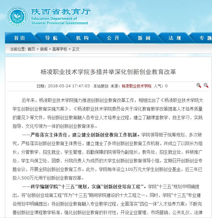 近年来,杨凌职业技术学院强力推进创新创业教育改革工作,相继出台了《杨凌职业技术学院大学生创新创业教育实施方案》、《杨凌职业技术学院委员会关于深化教育教学改革提高人才培养质量的意见》等文件,将创新创业教育融入各专业人才培养全过程,建立了融课堂教学、自主学习、实践指导、文化引领为一体的创新创业教育体系。
