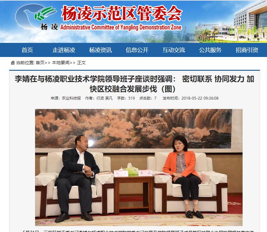 5月21日,示范区党工委书记李婧与杨凌职业技术学院党委书记赵曼及学院领导班子成员就区校融合协同发展相关事宜进行座谈。