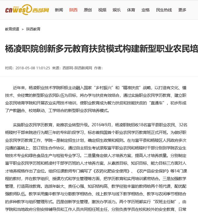 近年来,杨凌职业技术学院积极主动融入国家“乡村振兴”和“精准扶贫”战略,以打造有文化、懂技术、会经营的新型职业农民队伍为目标,将办学与扶贫有效结合,通过实施职业农民学历教育、建立职业农民培育学院和开展农业实用技术培训,使职业教育成为智力扶贫和技能扶贫的“直通车”,初步形成了产教融合、校地联动、工学结合的新型职业农民培养模式。