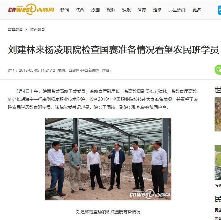 5月4日上午,陕西省委高教工委委员、省教育厅副厅长、省高教局副局长刘建林,省教育厅高教处处长胡海宁一行来到杨凌职业技术学院,检查2018年全国职业院校技能大赛准备情况,并看望了该院农民学历教育班学员。该院党委书记赵曼,院长王周锁,副院长张永良等陪同检查。