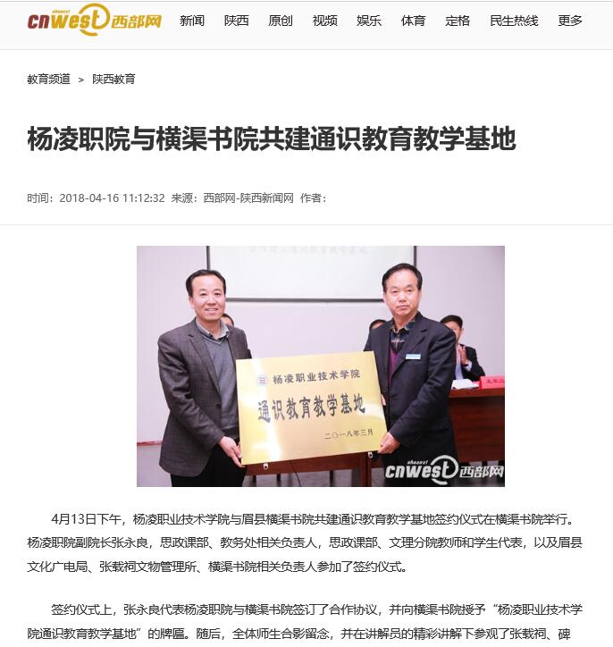 据了解,近年来杨凌职院多次组织师生到此参观学习,已与横渠书院建立了友好的合作关系。此次,该院与横渠书院签订合作协议,共同组建“通识教育教学基地”,既有效推进了学院承担的2017年省教育厅教育教学改革重点研究课题《高职院校通识教育知识体系构建研究与实践》项目,也丰富了“四位一体”人才培养方案中的通识教育课程体系。(陆敏 供稿)