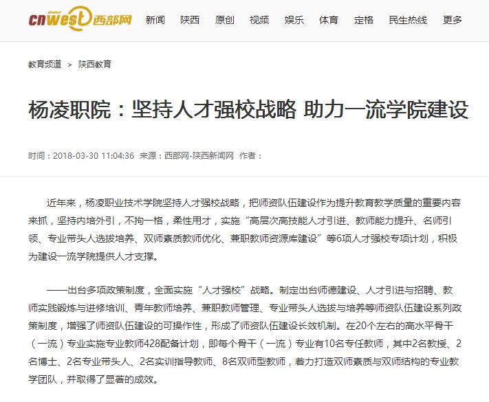 近年来,杨凌职业技术学院坚持人才强校战略,把师资队伍建设作为提升教育教学质量的重要内容来抓,坚持内培外引,不拘一格,柔性用才,实施“高层次高技能人才引进、教师能力提升、名师引领、专业带头人选拔培养、双师素质教师优化、兼职教师资源库建设”等6项人才强校专项计划,积极为建设一流学院提供人才支撑。
