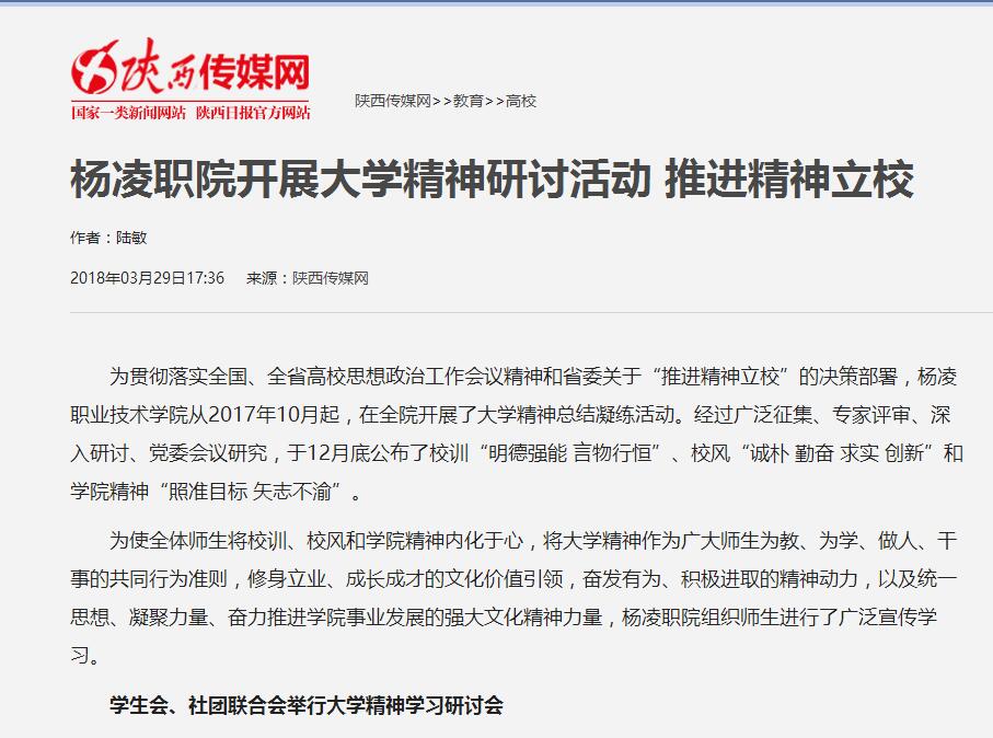 为使全体师生将校训、校风和学院精神内化于心,将大学精神作为广大师生为教、为学、做人、干事的共同行为准则,修身立业、成长成才的文化价值引领,奋发有为、积极进取的精神动力,以及统一思想、凝聚力量、奋力推进学院事业发展的强大文化精神力量,杨凌职院组织师生进行了广泛宣传学习。