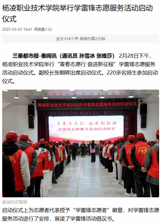 三秦都市报-秦闻讯(通讯员 孙雪冰 张唯莎) 2月28日下午,杨凌职业技术学院举行“青春志愿行 奋进新征程”学雷锋志愿服务活动启动仪式。副校长张朝晖出席启动仪式。220多名师生参加启动仪式。