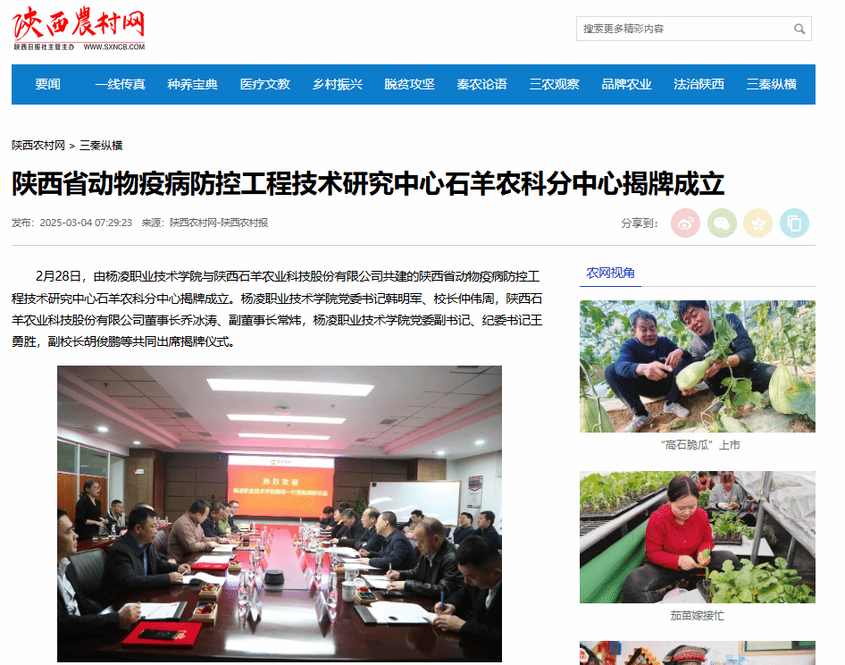 2月28日,由杨凌职业技术学院与陕西石羊农业科技股份有限公司共建的陕西省动物疫病防控工程技术研究中心石羊农科分中心揭牌成立。杨凌职业技术学院党委书记韩明军、校长仲伟周,陕西石羊农业科技股份有限公司董事长乔冰涛、副董事长常炜,杨凌职业技术学院党委副书记、纪委书记王勇胜,副校长胡俊鹏等共同出席揭牌仪式。