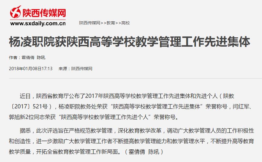 近日,陕西省教育厅公布了2017年陕西高等学校教学管理工作先进集体和先进个人(陕教〔2017〕521号),杨凌职院教务处荣获“陕西高等学校教学管理工作先进集体”荣誉称号,闫红军、郭旭新2位同志荣获“陕西高等学校教学管理工作先进个人”荣誉称号。