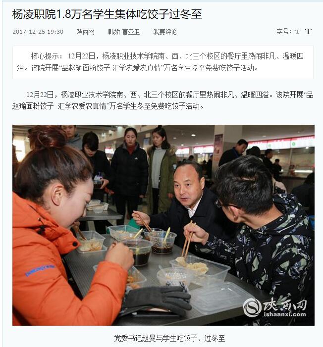 12月22日,杨凌职业技术学院南、西、北三个校区的餐厅里热闹非凡、温暖四溢。该院开展“品赵瑜面粉饺子 汇学农爱农真情”万名学生冬至免费吃饺子活动。